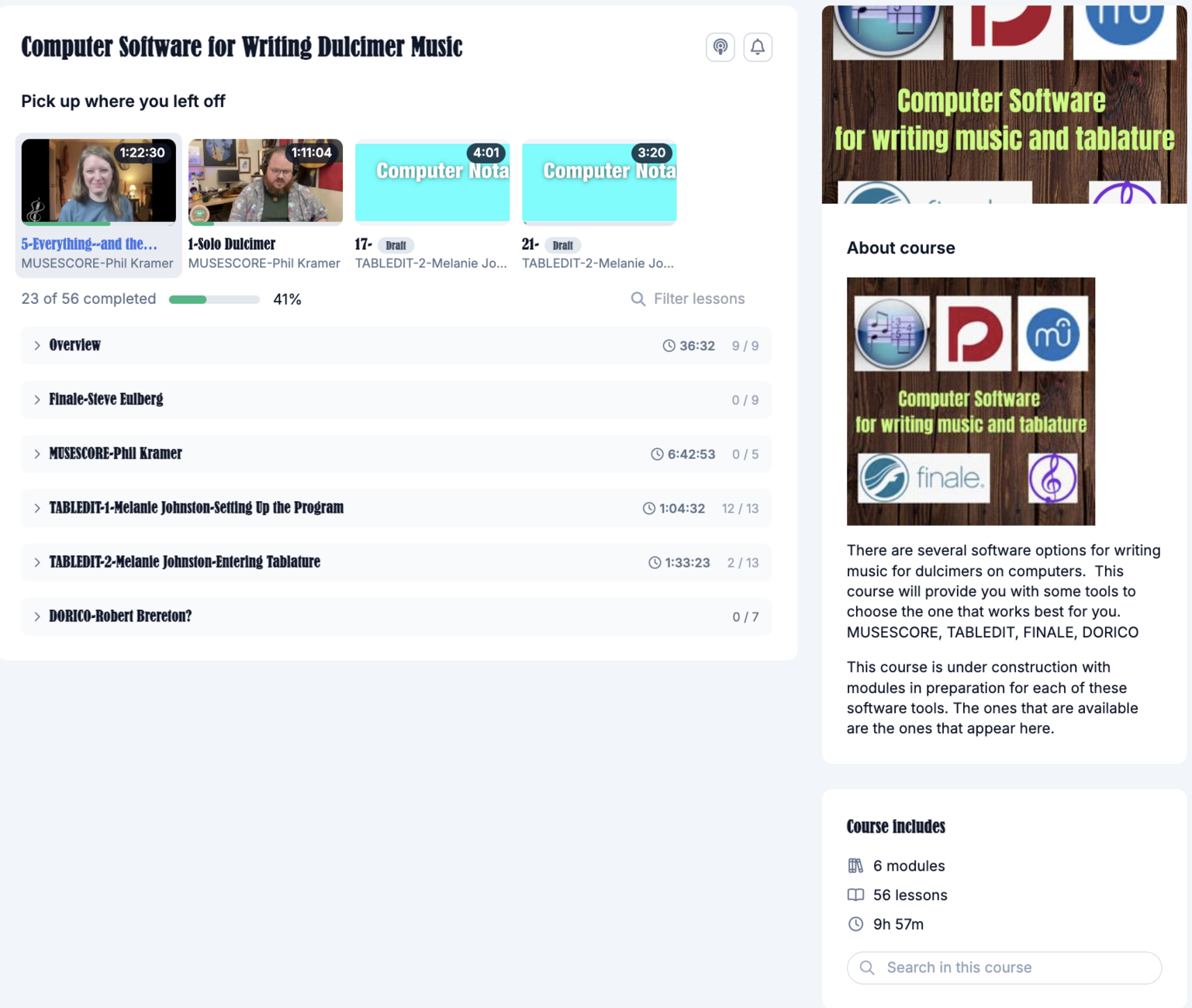 The full course for members of DulcimerCrossing.com demonstrates the use of FINALE, MUSESCORE, TABLEDIT and other software for notating music for mountain and hammered dulcimers.